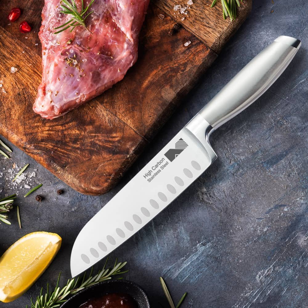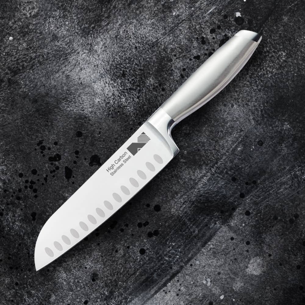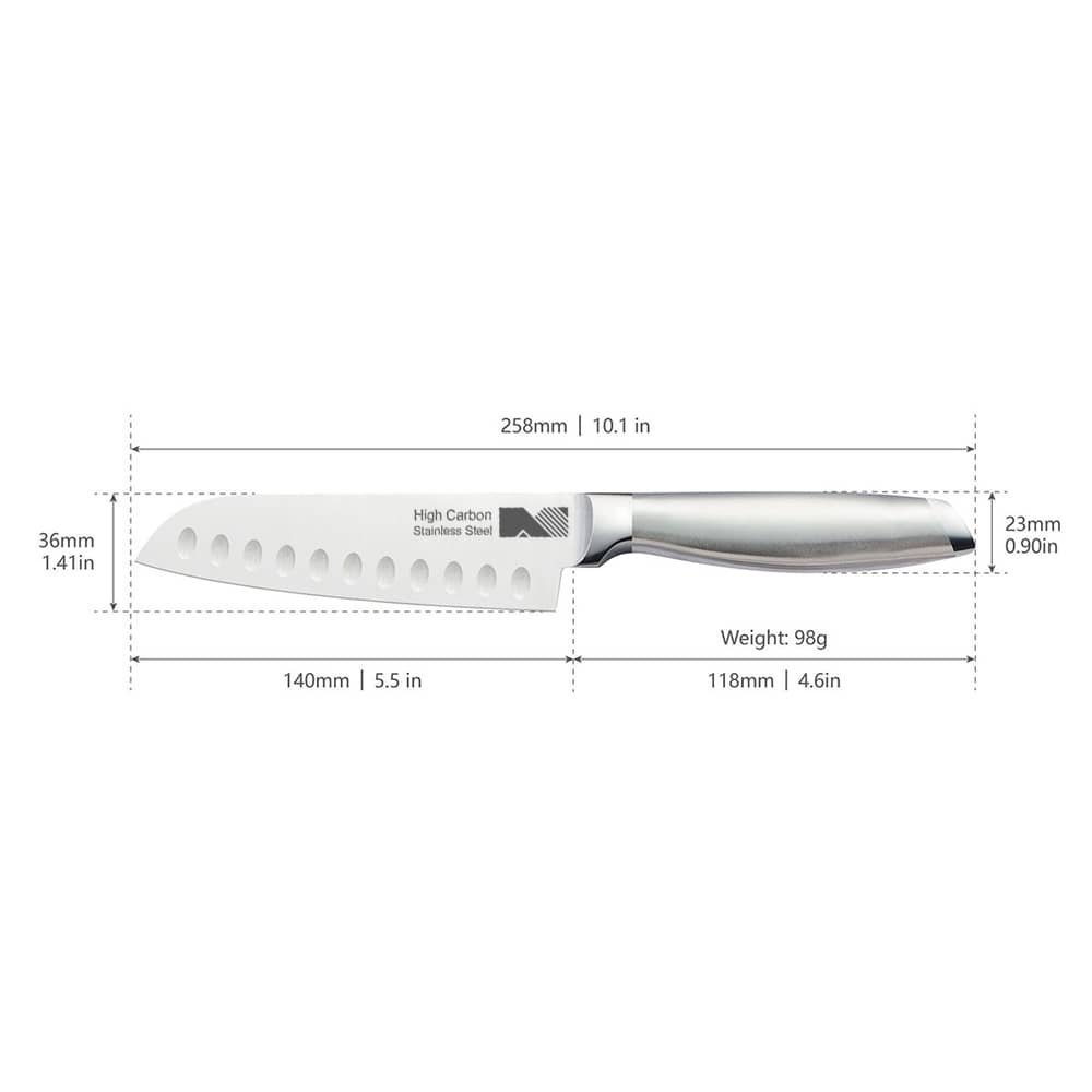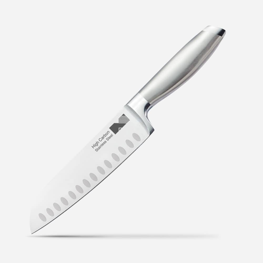 Combining the benefits of a chef’s knife and cleaver, this santoku is indispensable for chopping, slicing and dicing. Oval indentations on the blade’s sides reduce friction to produce clean, uniform cuts and minimize sticking.