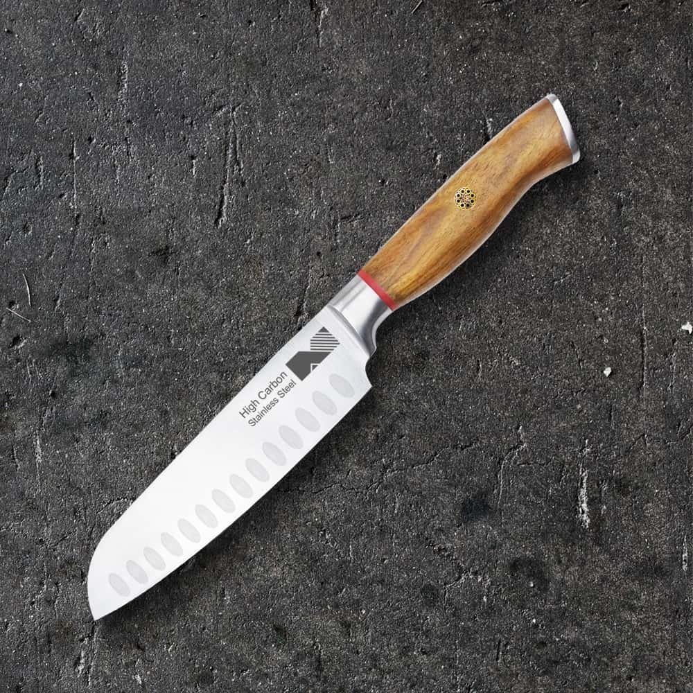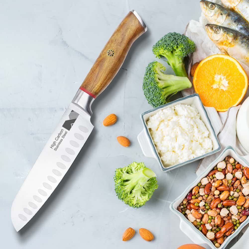 Combining the benefits of a chef’s knife and cleaver, this santoku is indispensable for chopping, slicing and dicing. Oval indentations on the blade’s sides reduce friction to produce clean, uniform cuts and minimize sticking.